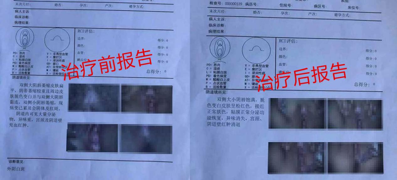 我当时只是抱着试试看的心态,就按照老师给我提供的方案开始用药治疗,都是些中成药,在家使用很方便。刚用完药后整个外阴比较清爽舒服,裂口的地方也没有刺痛和不适感,才用药两三天就没有痒了,溃烂的伤口也开始结痂,大概用药有一个疗程的样子,我有天洗澡的时候发现,我发白的地方比以前小,起初不相信,我就翻以前的照片,认真对比一下,真的小一部分了,外阴两侧的皮肤摸起来也变得光滑了一些。老师说我的病情恢复的很好,让我坚持用这个药治疗,在巩固用药后变白的皮肤颜色就正常了,之前萎缩的阴唇也变得饱满有弹性了,再次来到医院做检查时:报告显示之前的症状完全消失了,一切都正常了。